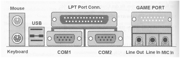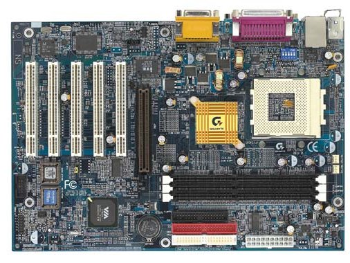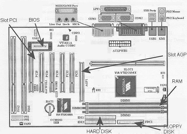 Nell'immagine sopra e' rappresentata una scheda madre di tipo slot 1. Sono raffigurati 2 slot ISA (ISA1 e ISA2), 5 slot PCI (PCI1, PCI2, PCI3, PCI4 e PCI5), la batteria (BAT1), uno slot AGP (AGP1), 2 connettori EIDE (IDE1 e IDE2) un connettore per floppy disk (FDC1), 3 slot per i banchi di memoria RAM (DIMM1, DIMM2 e DIMM3), 2 porte seriali (COM1 e COM2), una porta parallela (LPT1) 2 porte USB (USB1), 2 porte PS/2 per mouse e tastiera (KM1) un' uscita MIDI o per JOYSTICK (MDI/GAME port) un chipset VIA ed infine uno slot 1 per connettere la CPU.